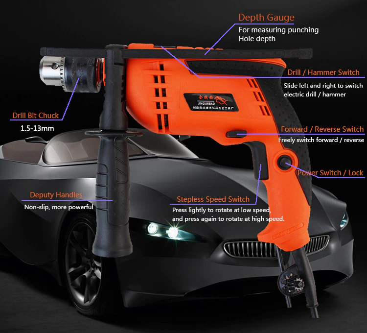 This machine is ideal for impact drilling in brick, concrete, and stone as well as for drilling in wood, metal, and plastic. Machines with electronic control and right/left rotation are also suitable for screw-driving and thread-cutting.